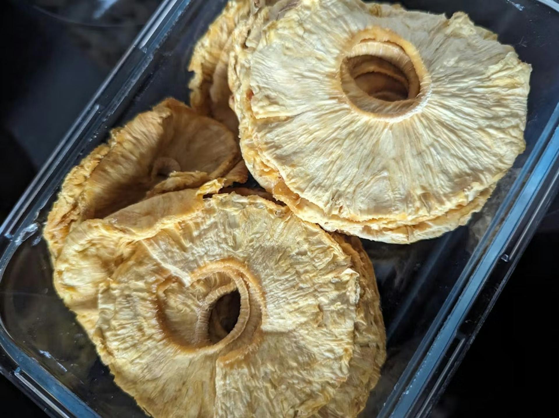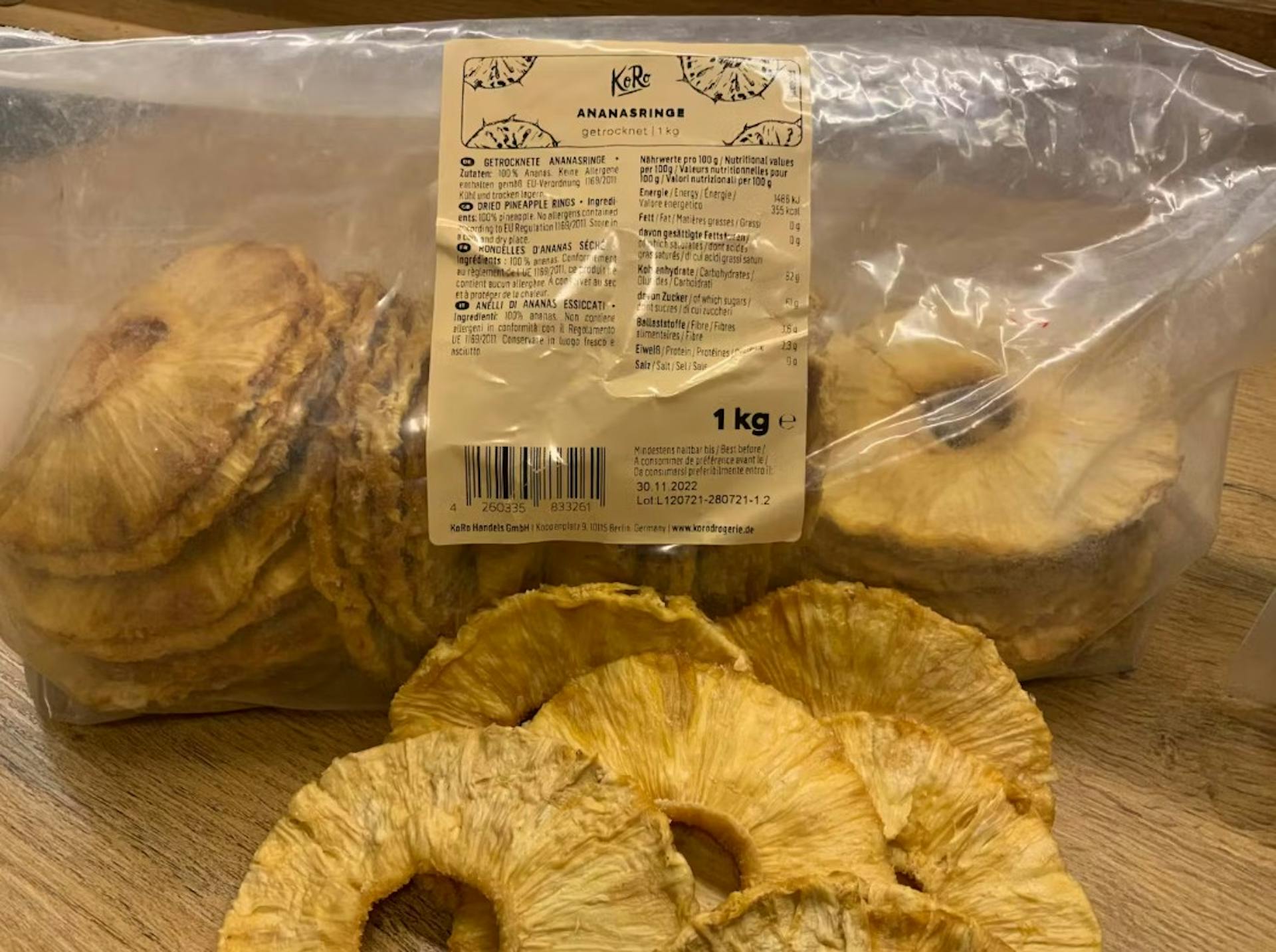 Ananasringe ohne Zuckerzusatz 1 kg | Probiergröße Ananasringe ohne Zuckerzusatz 200 g | Gefriergetrocknete Ananasstücke 350 g | Gepuffte Bio Ananasstücke 500 g | Getrocknete Ananasstücke 2 kg | |
