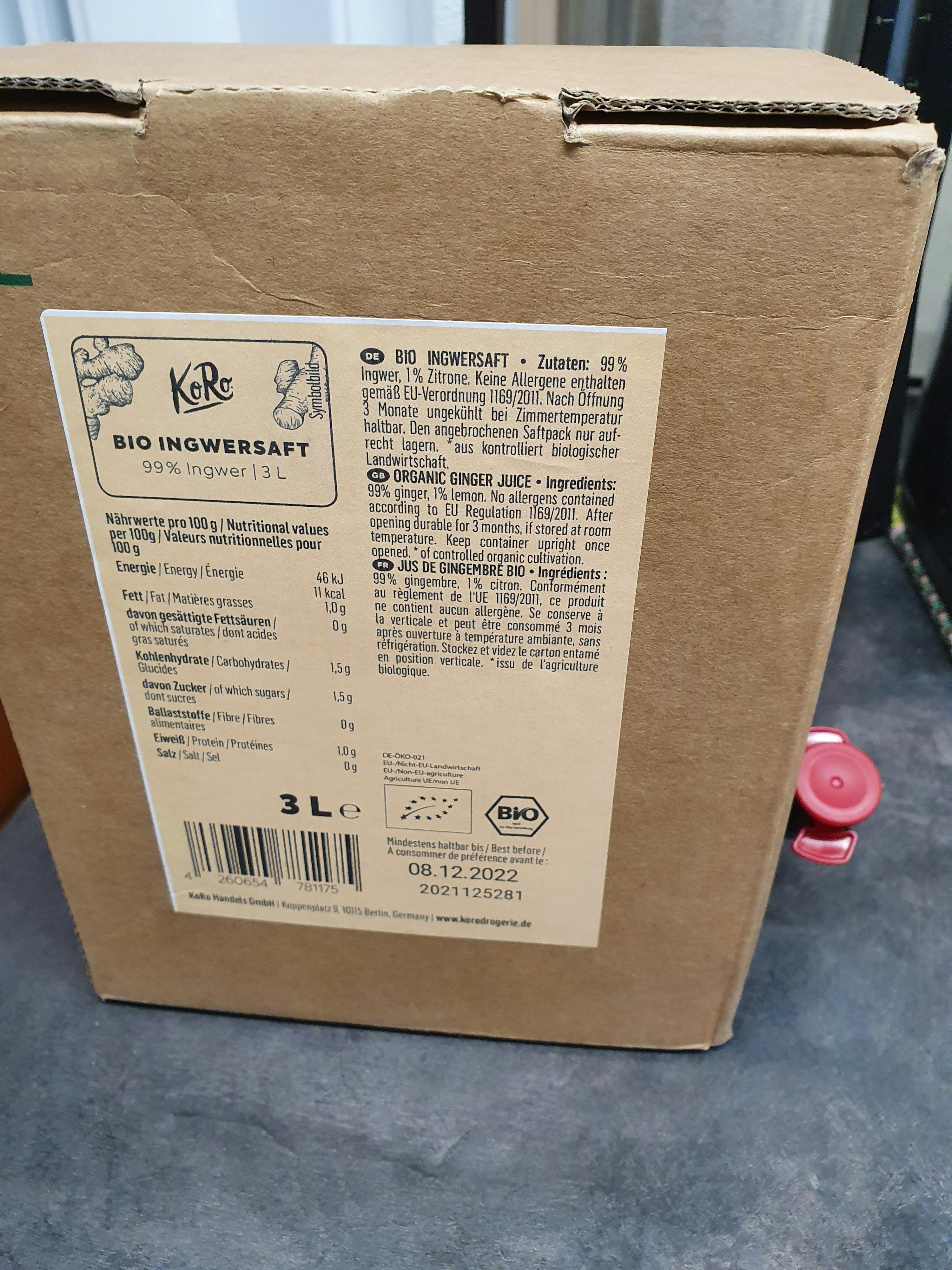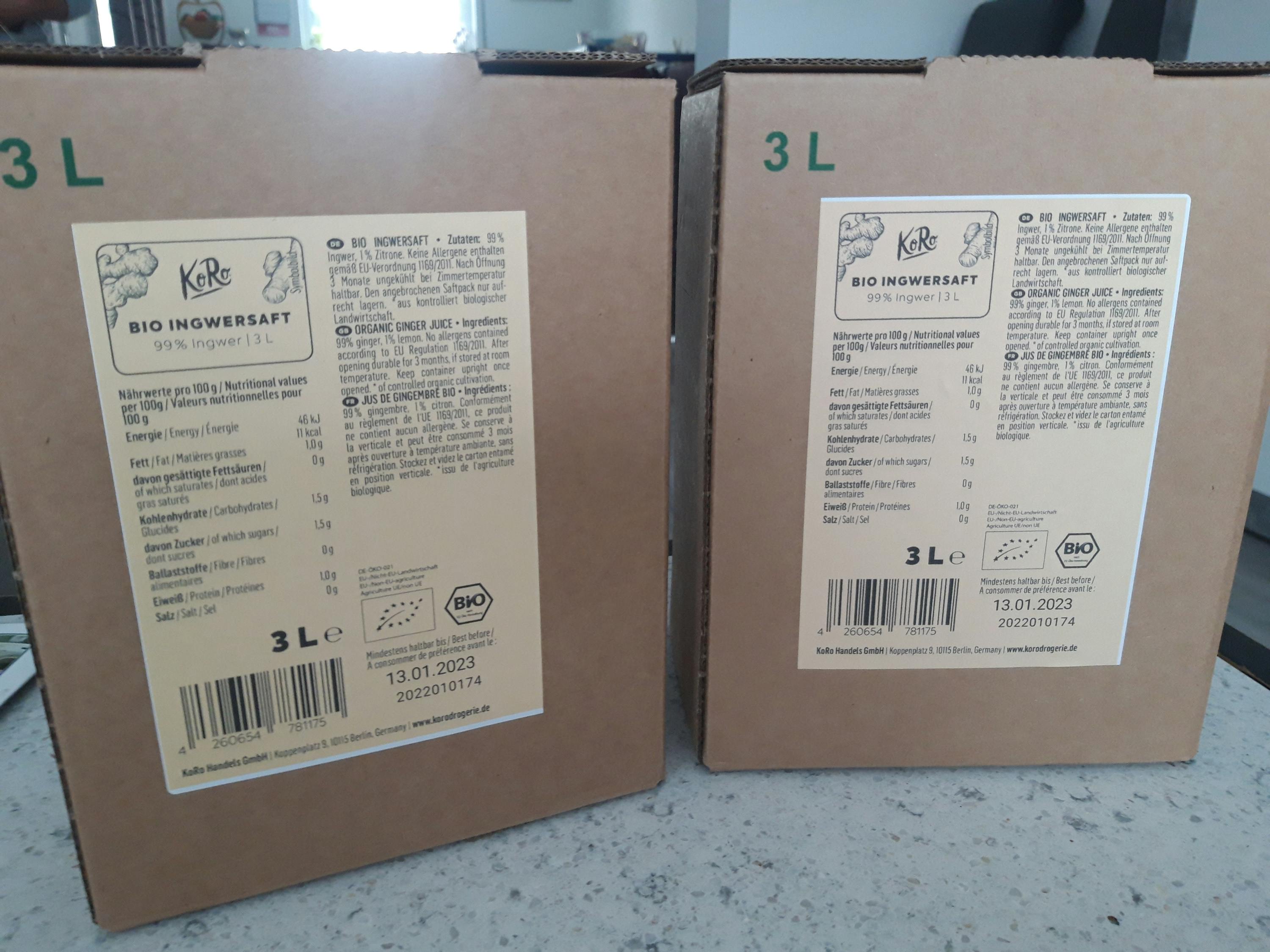 Ich zitiere:"Etikettenfehler? Ich habe 2 mal Bio Ingwersaft Bag-in-Box zu je 3 Liter bestellt.