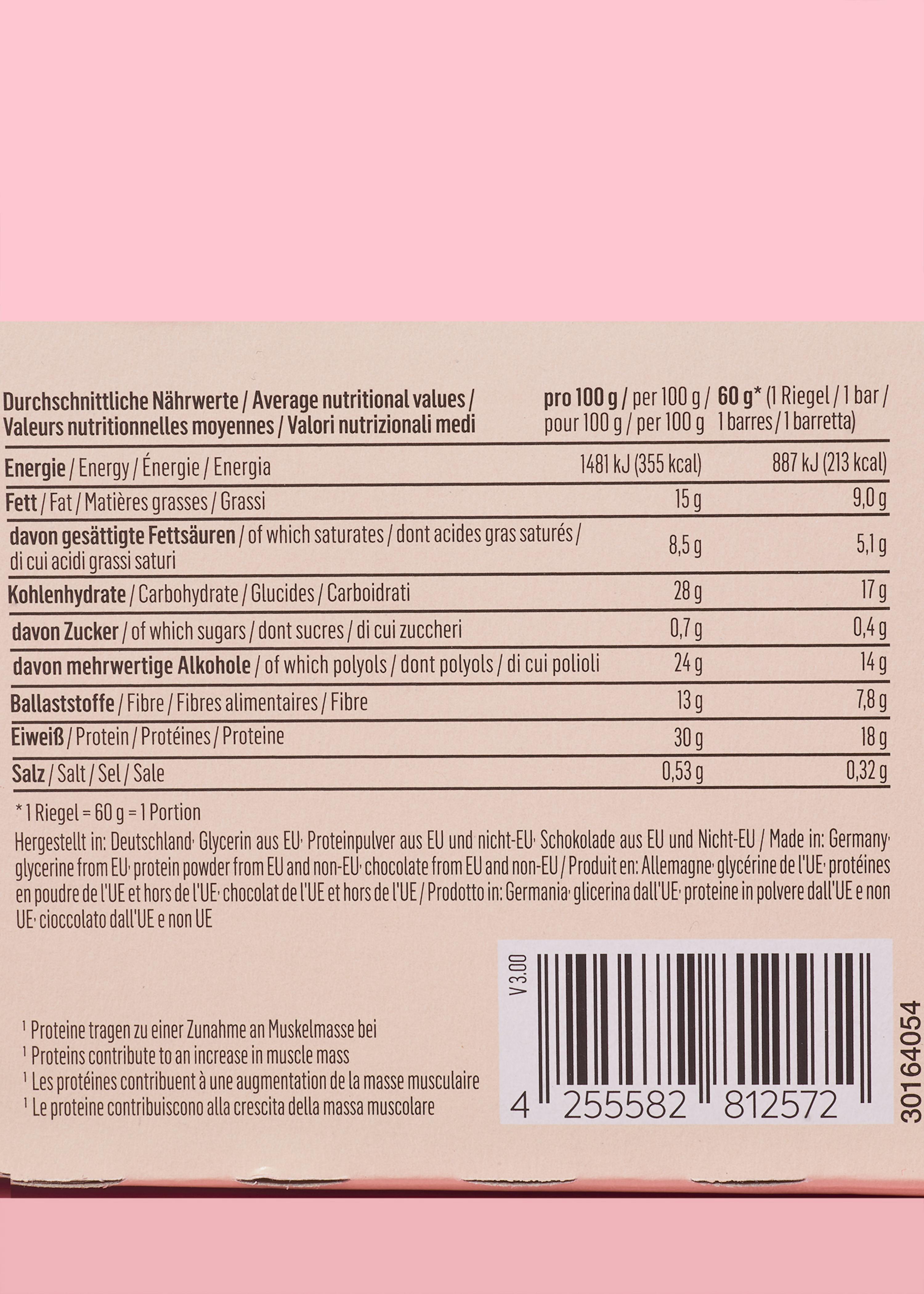 | Zutaten | Kakaomasse, Süßungsmittel: Maltit; Feuchthaltemittel: Glycerin; Calcium-CASEINAT, MOLKENPROTEINISOLAT, Füllstoff: Polydextrose, SOJAPROTEINISOLAT, Wasser, Kollagenhydrolysat², Kakaobutter, Oligofructose, Dextrin (WEIZEN), fettreduziertes Kakaopulver, natürliches Aroma, Kokosöl, Rapsöl, MANDELPROTEIN, Tapiokastärke, Erbsenprotein, natürliches Vanillearoma, Salz, Emulgator: SOJALECITHINE, Mono- und Diglyceride von Speisefettsäuren; modifizierte Maisstärke, Säureregulator: Natriumhydroxid, Natriumcitrat; Süßungsmittel: Sucralose. Kakao: 43,5 % mindestens in der Schokolade. ²nicht vegetarisch |