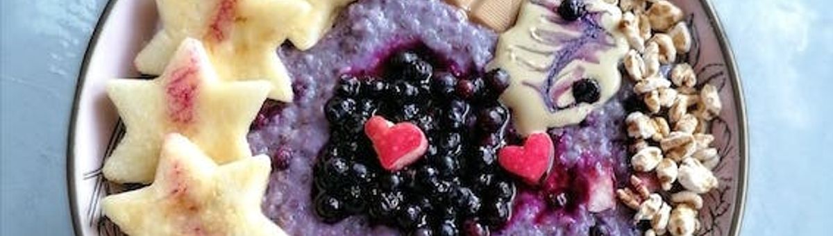 Haferflocken mit Chiasamen mischen und zusammen mit den gefrorenen Blaubeeren in einem Topf mit Wasser und Haferdrink ca. 3 Minuten köcheln lassen.