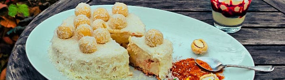 Lass die Torte abkühlen und kleide sie dann in Kokosraspeln ein. Fertig!