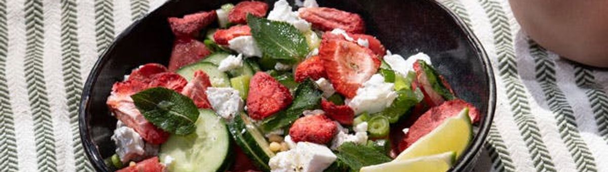 Schnibbel die Wassermelone in mundgerechte Stücke, brösel die vegane Veta-Mischung (die musst Du vorher nach Packungsanweisung aufkochen) darüber, zupfe Minzblätter ab und schnibbel ein paar Frühlingszwiebeln und Gurke rein.