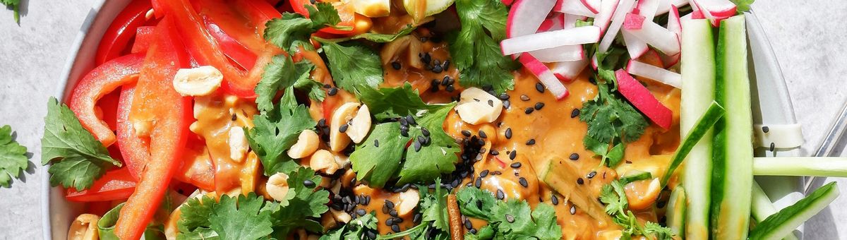 Das Erdnussmus und den Orangensaft mit einem Schneebesen verrühren. Danach die restlichen Zutaten für das Dressing hinzufügen und gut umrühren.