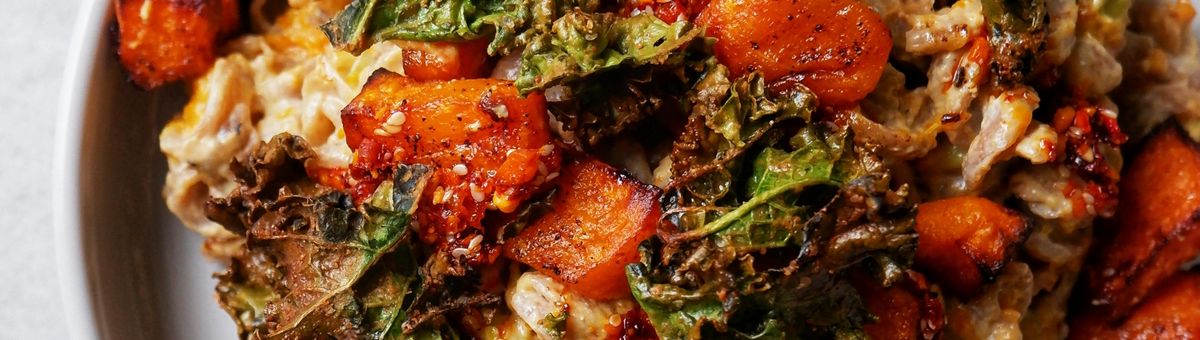 Cremige Pasta, süßer Kürbis, scharf-würziges Chiliöl und knusprige Grünkohlchips. Crunche los!