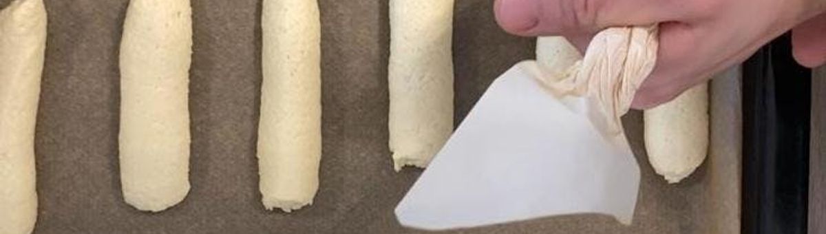 Die fertige Masse in einen Spritzbeutel geben und auf einem Backblech ca. 4–5 cm lange Löffel-Biskuits spritzen.